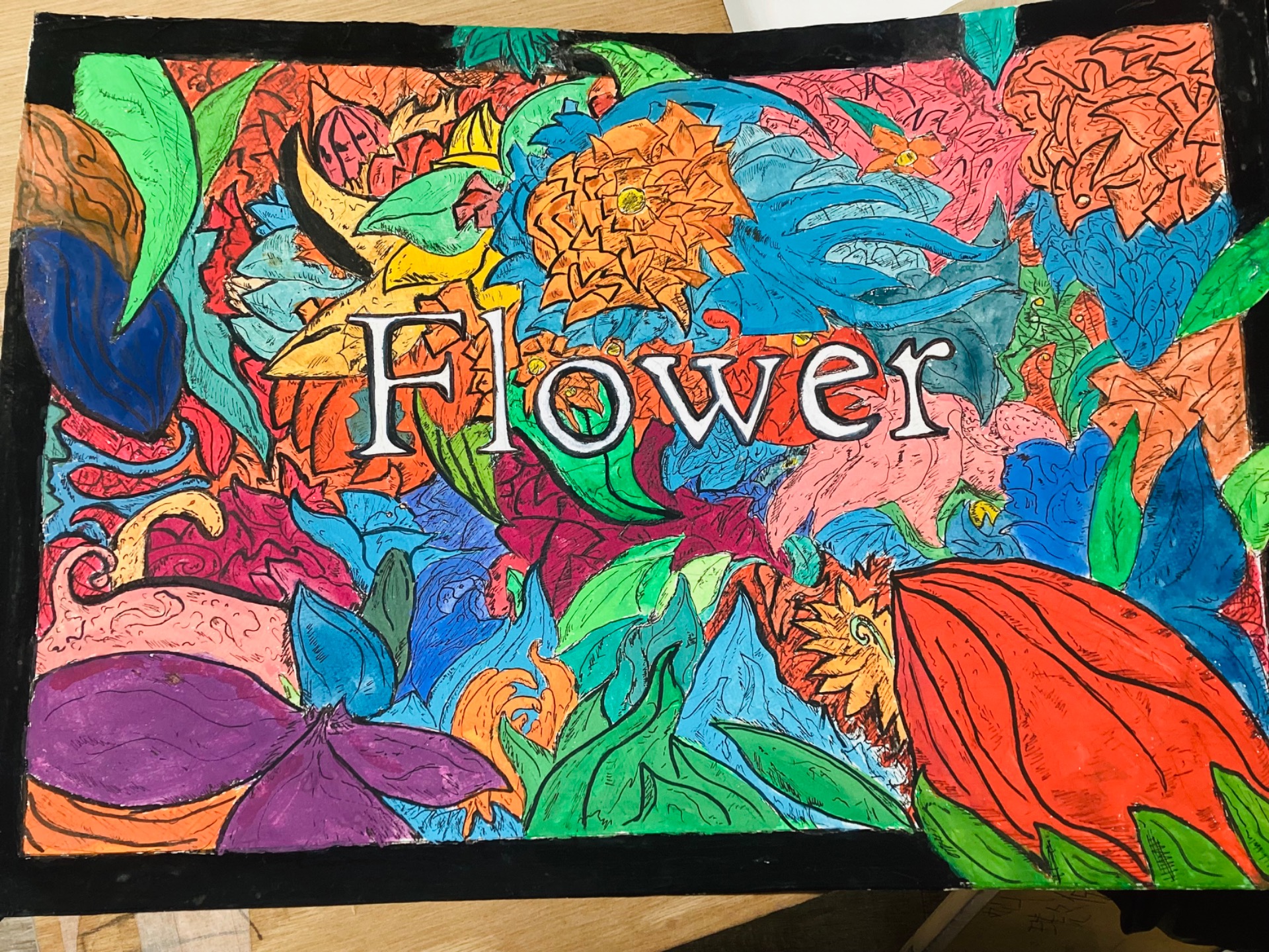 アクリル絵の具とミリペンやマッキーを使いました、画用紙に書きました、お題は花、だったので、花の生命力、華やかな感じの中にふくまれた野生さを意識しました、全部俺が考えた架空の花です。